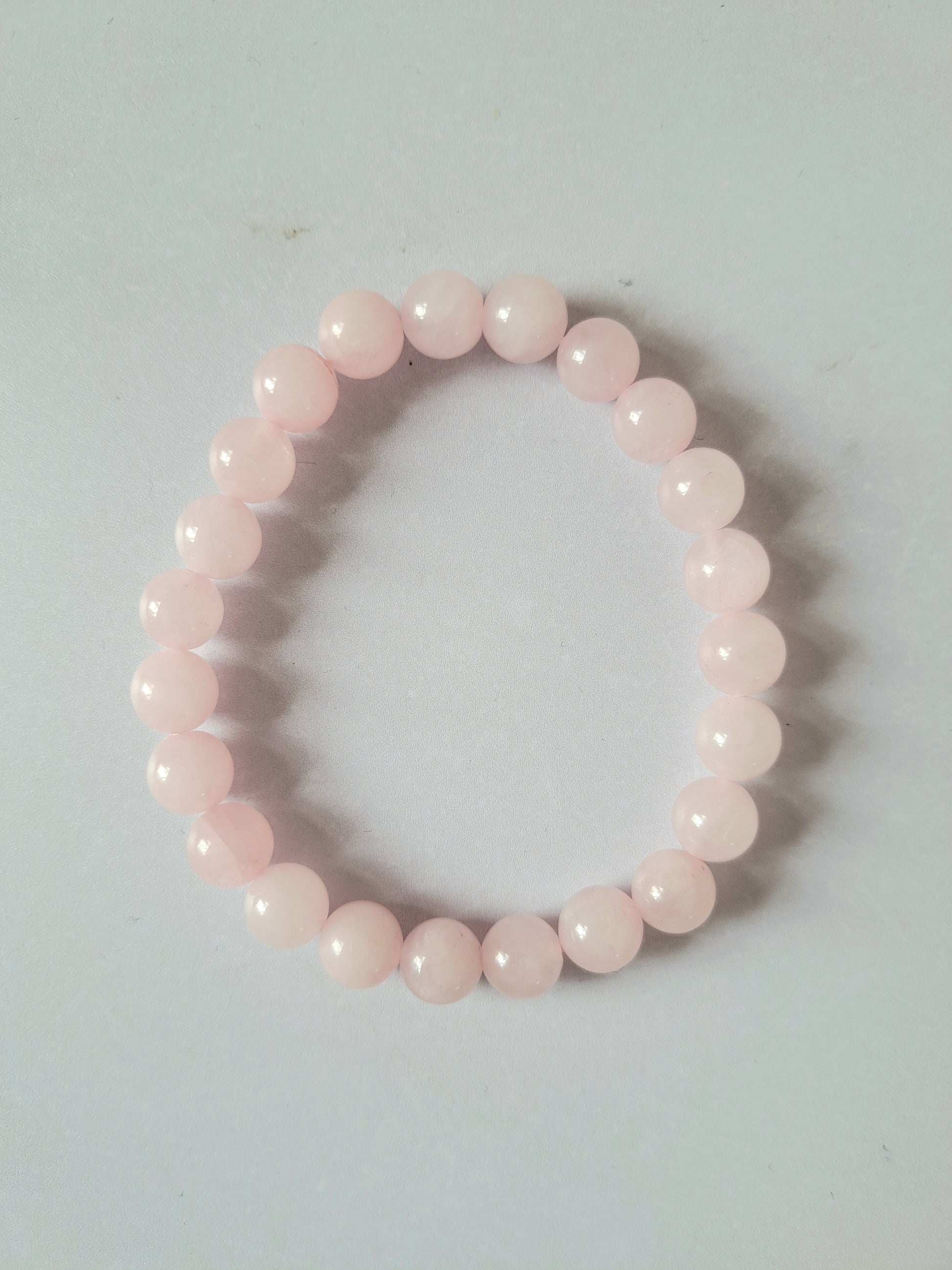 Roze kwarts kralenarmband met 8 mm kralen. Aan elastiek geregen.