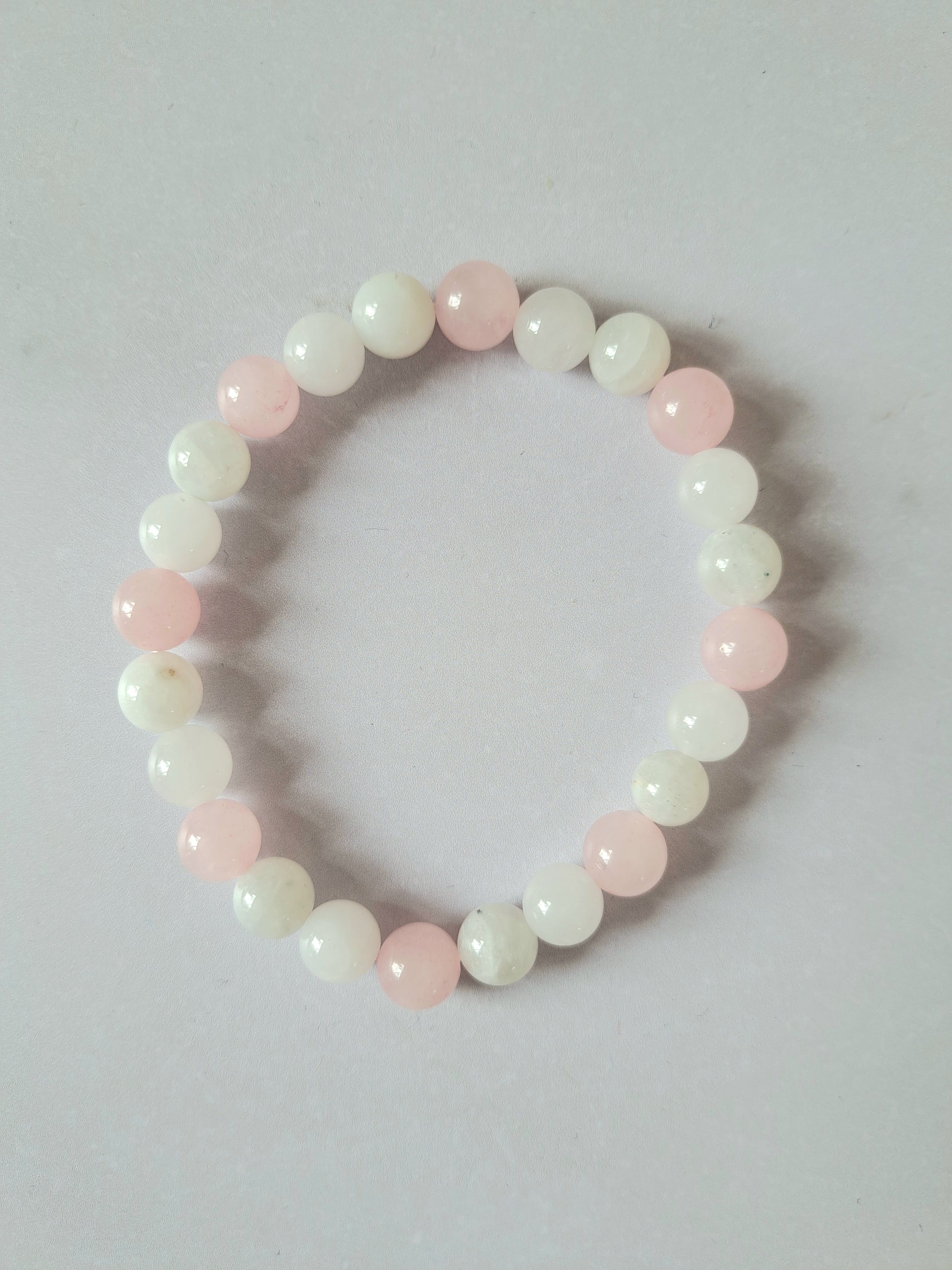 Kralenarmband Vruchtbaarheid, met Maansteen wit, Roze kwarts, en Jade. Deze armband is geregen op elastiek en ca. 18 cm lang.