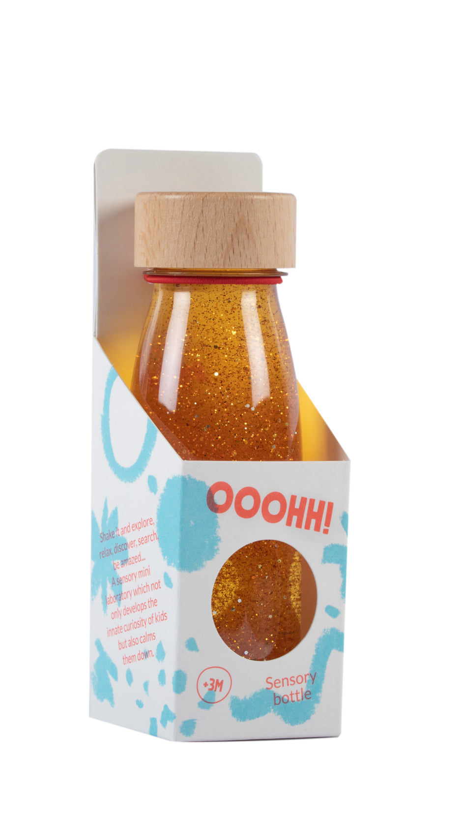 De Petit Boum Float Bottle is een betoverend flesje waarin kleurrijke figuurtjes en vormen rustig door de vloeistof zweven. Door te schudden, kantelen of langzaam te draaien, ontdekken kinderen steeds opnieuw een wereld vol kleur en beweging. Het zachte, trage zweven werkt kalmerend en helpt kinderen ontspannen en hun aandacht te focussen.
