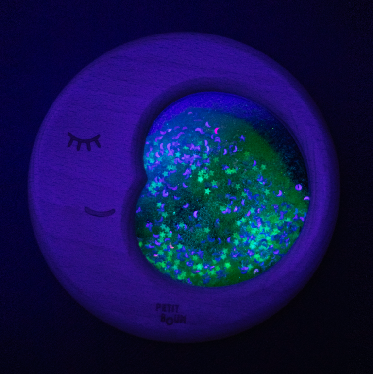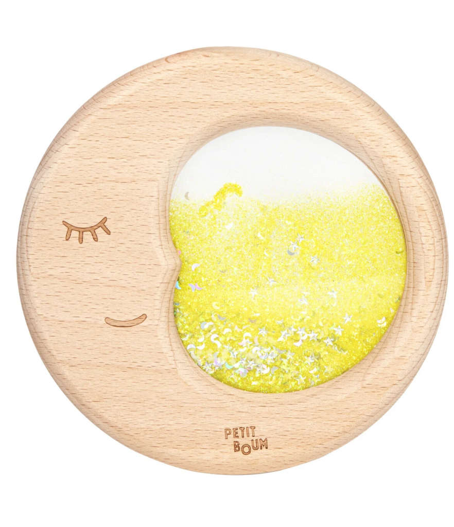 De Petit Boum Sensorische Maan laat kinderen wegdromen in een wereld vol glinstering en rust. Wanneer je het flesje kantelt of schudt, dwarrelen sterren en maanlicht-achtige details langzaam door de vloeistof. Het zachte, trage bewegen heeft een kalmerend effect en helpt kinderen hun aandacht te focussen en spanning los te laten.